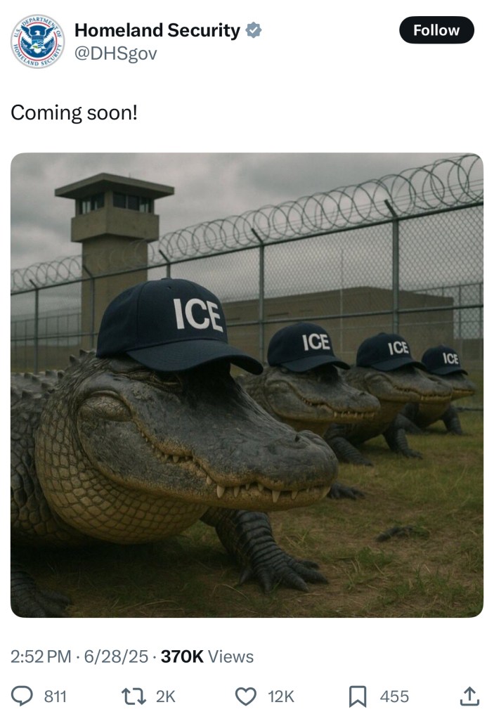After Ron DeSantis and his attorney general introduced the plan for Alligator Alcatraz, the federal government tweeted out an image of alligators wearing ICE hats. This horrifying imagery is chilling, and promotes the idea that Floridians support the idea of feeding migrants to alligators.