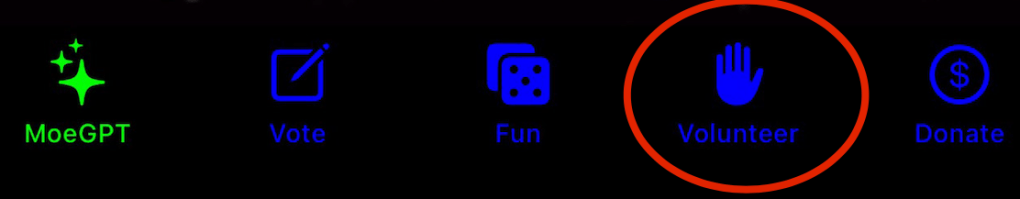 Volunteer for Team Moe by downloading MoeGPT from the App Store and tapping the “Volunteer” icon. Once you sign up as a Volunteer, you can phone bank for the campaign, text voters and connect with other Volunteers, all from within the app.